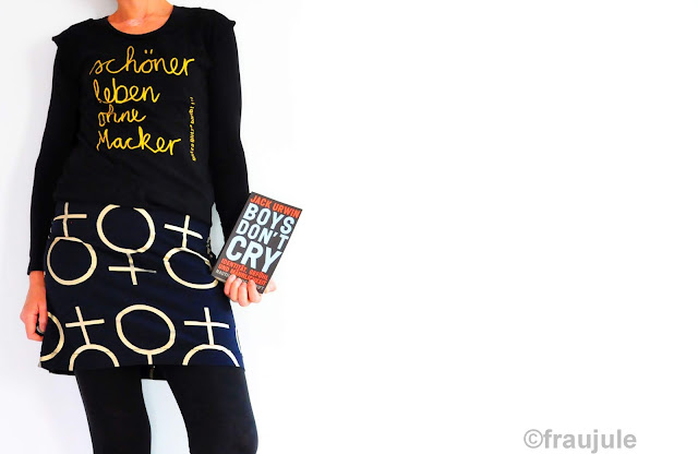 Passenderweise hatte ich dazu auch noch das perfekte Shirt im Schrank. Ergaunert auf dem Queer Zine Fest im Frühjahr. Es stammt von Glitzaglitza in Berlin. Gekauft in XXL und ein wenig umgeschneidert, damit es mir passt. Ich hab´s bezahlt, darum ist das keine Werbung. Und wie nötig ich dieses Shirt in diesem Jahr habe, glaubt man gar nicht. Und eigentlich nicht nur ich, sondern alle Menschen. Die Macker mit eingeschlossen. Ich