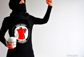 "Und der Polizist so: „Ich kann kein Spanisch, ‚Barista, Barista antifascista‘ oder so.“" (Zitat ebd.) Guten Morgen, Zeit für einen Latte Marxiato. Und endlich mal etwas, was diese langweiligen, weißen Kaffeetassen ganz hinten in meinem Schrank doch mal ein bisschen aufpoliert. Ja, ich habe mehr als alle Tassen im Schrank. Mensch kann ja niemals genug Flagge.... äääähhh... Tasse gegen Faschismus zeigen.